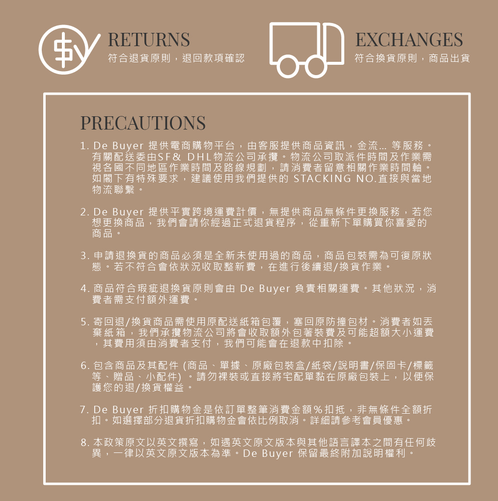 5.若您有任何疑慮,歡迎與我們線上客服聯繫或是使用 : Facebook Messenger (DE BUYER HONG KONG) / (周一至周五,早上九點至晚上六點)