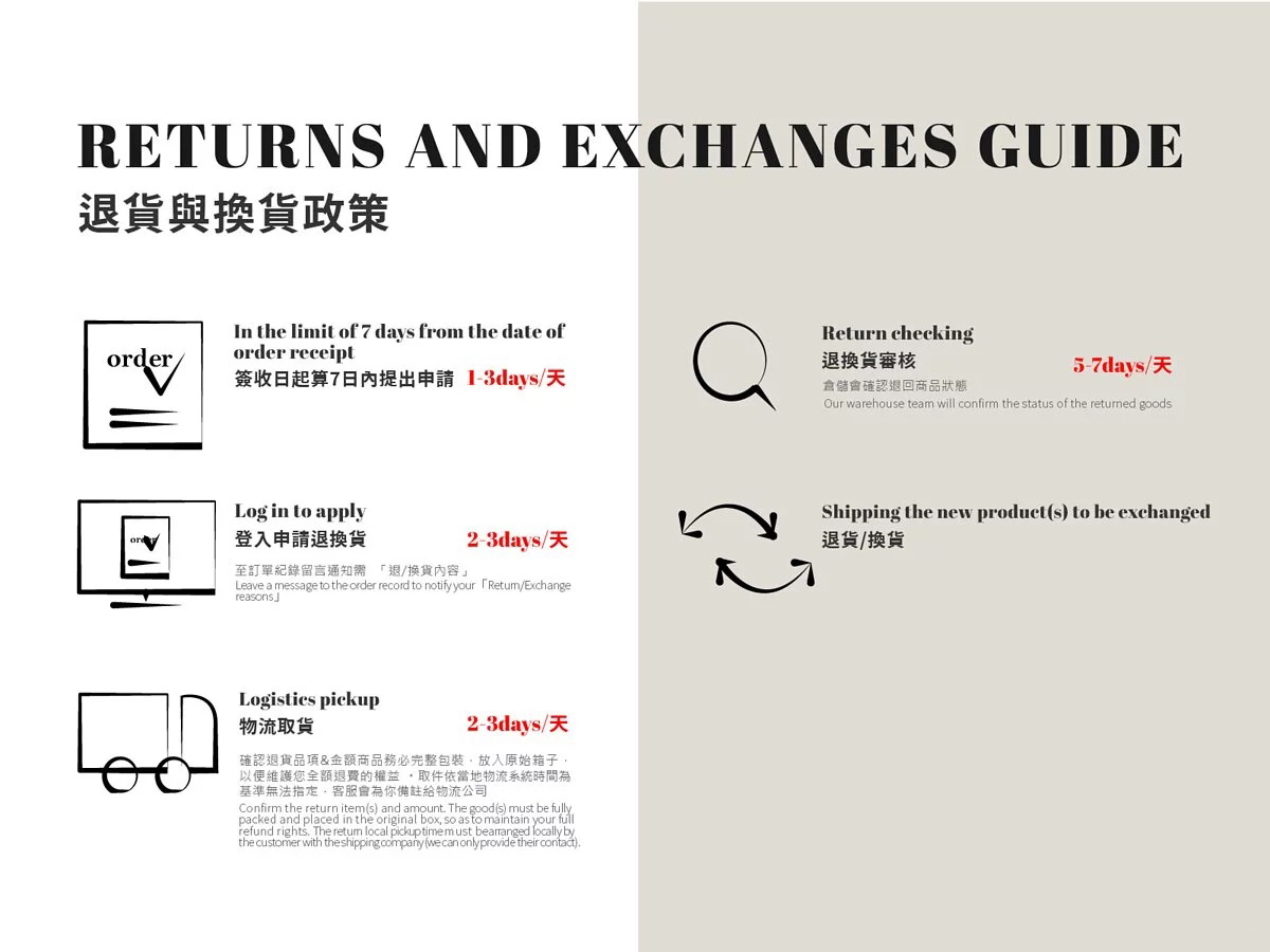 注意:顧客勿自行選用未經我們同意的速遞公司寄回商品,此舉將可能造成我們倉庫拒收退回你的地址,並由閣下自行支付物流費用。