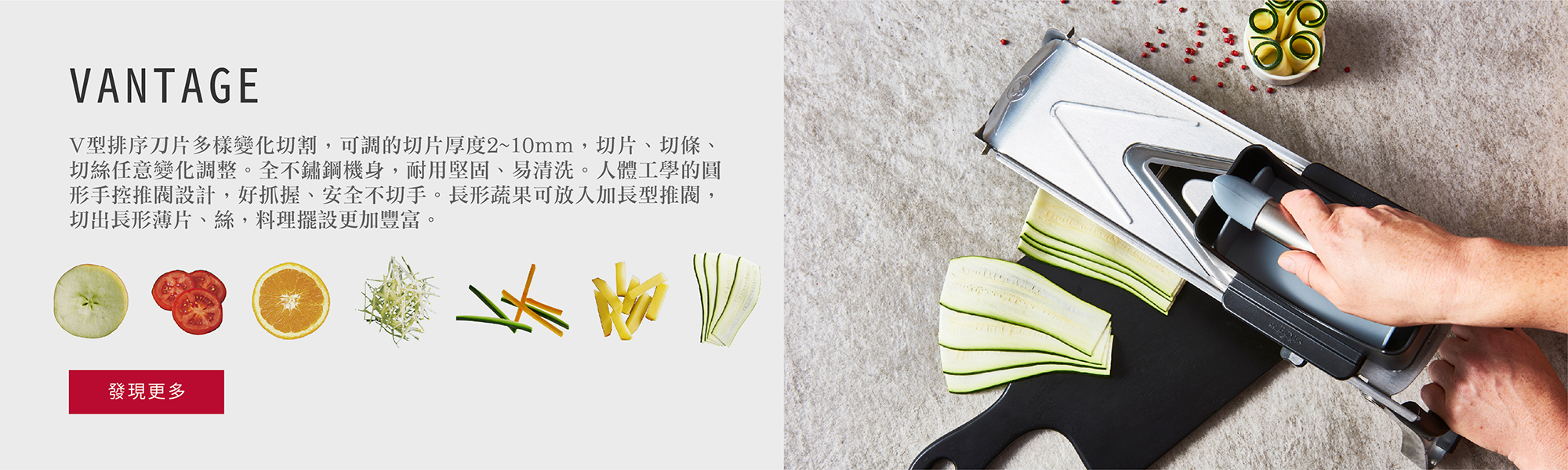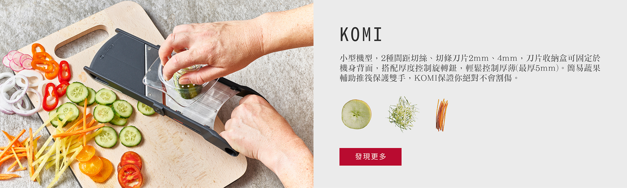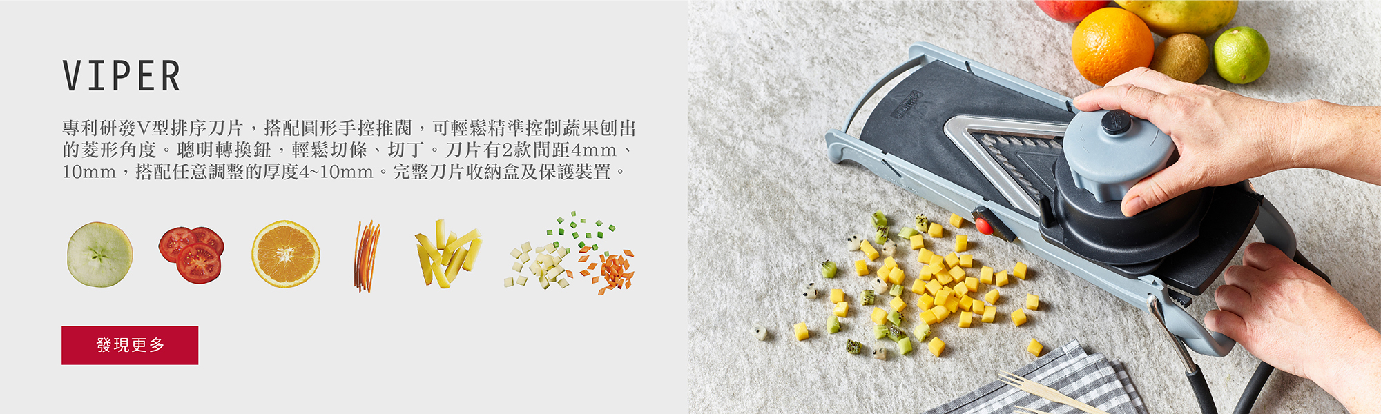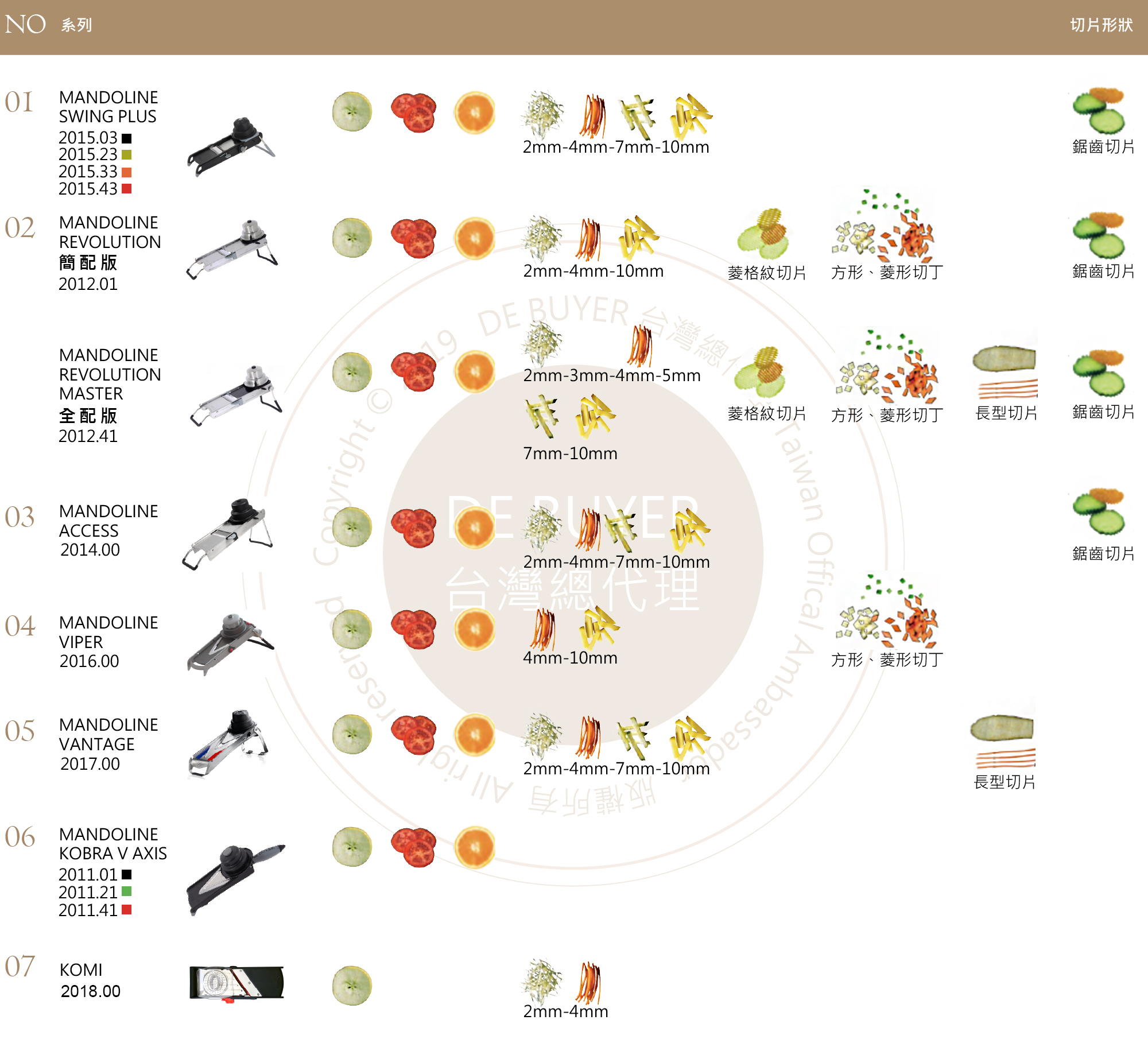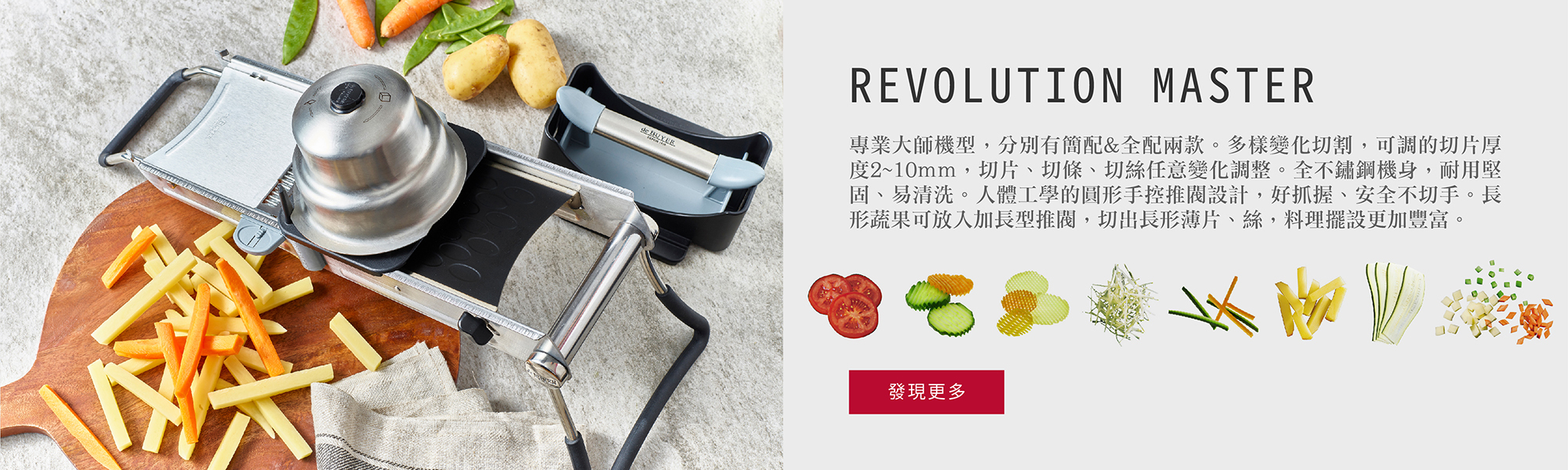 de Buyer 曼搖系列總共有6種機型,每一台都能讓你像專業廚師一樣快速切蔬果的處理器,快速且安全!de Buyer 曼搖是全世界生產製造蔬果快速刨切機的先鋒, 一台主體機型隨著配件刀數的不同,可切絲、條、片、塊,級距變化多元!且每一環節都在法國完成設計開模與製造,提供專業餐廳大量使用時所需的穩定性及機動性,了解消費者的需求。更重要的是每一個配件都能換購,當因使用耗損或是遺失時,都能額外單獨購買每一個配件!!