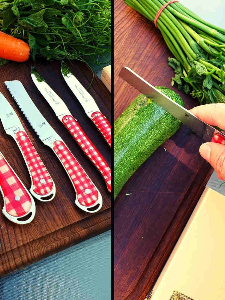 1902 Vichy紅方格織布系列廚刀為法國傳統刀款,製作精細,刀鋒銳利。刀身輕巧,使用起來輕鬆省力。繽紛精緻的握柄有著透明壓克力內襯紅白相間的格紋布,為法國薇姿(Vichy)產的織布。1902年是C. Dozorme餐具於法國Thiers城市(歐洲餐具之都)問世的經典年份。